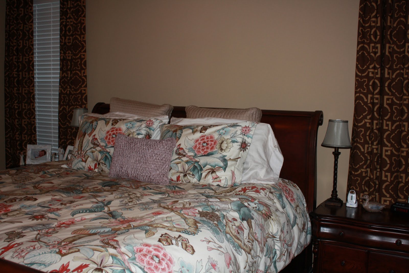 Our new bedroom curtains. I bought this fabric before we went to the beach at the end of June/first of July, and just got around to making the curtains last week. I think they turned out great. It's hard to get a picture of it all together, because the room is so big. I love that the height of the curtains draws your eyes up to the tray ceiling above the bed. I LOVE my bedroom, and this makes me love it even more. I am still on the fence about what to hang above our bed. I bought a big canvas to paint something, but I also have an iron piece that I think would look great above it. Don't know what I am going to do. Let's hope it doesn't take 6 months to decide!! Our bedding came from Pottery Barn. It is the Audrey collection, and I think it is timeless.